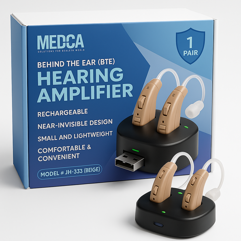 Zestaw MEDCA Hearing Amplifier (model JH-338, kolor beżowy) to nowoczesne wzmacniacze słuchu typu BTE (Behind The Ear), zaprojektowane z myślą o komforcie i dyskrecji.